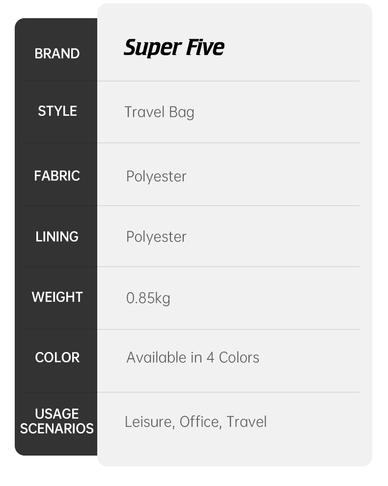 - تنوع بالا:سوپر فایو طیف گستردهای از محصولات را ارائه میدهد، از جمله کولهپشتیهای زنانه و مردانه، کیفهای دوشی، ساکهای ورزشی و سفری، و اکسسوریهای مختلف.