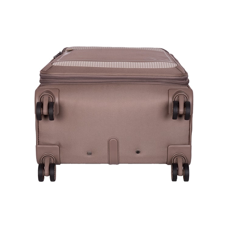 جنس بدنه این چمدان از پلی استر 100 درصد میباشد و تراکم بافت فوق العاده بالایی دارد که سبب ضد آب بودن چمدان میشود. همچنین کلاف و یا فریم این چمدان فنر کار شده است که به هیچ عنوان د فرمه نمیشود، چرخ های این چمدان 360 درجه و بسیار روان می باشند.