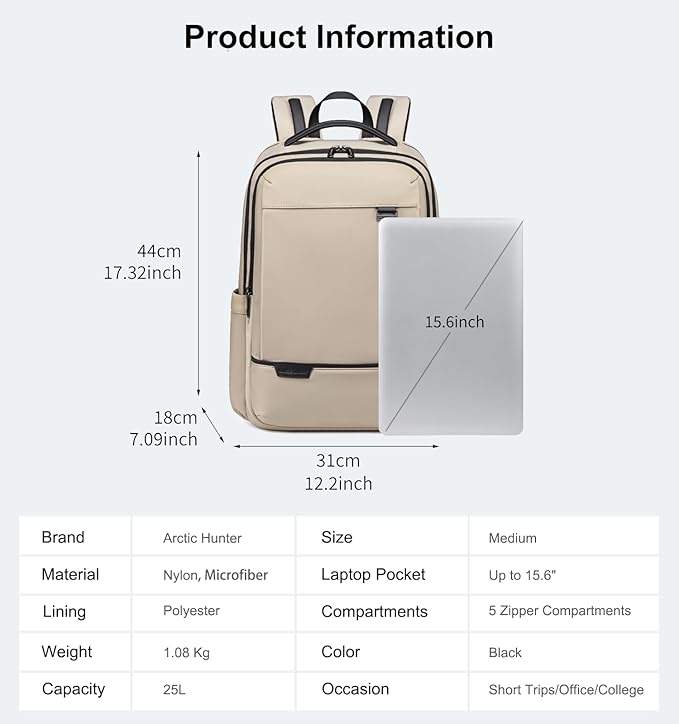 ابعاد و ظرفیت: کوله پشتی دارای ابعاد 44 × 30 × 15 سانتیمتر و ظرفیت 25 لیتر است که برای حمل لپتاپ، تبلت، لوازم جانبی و برخی وسایل شخصی مناسب میباشد.