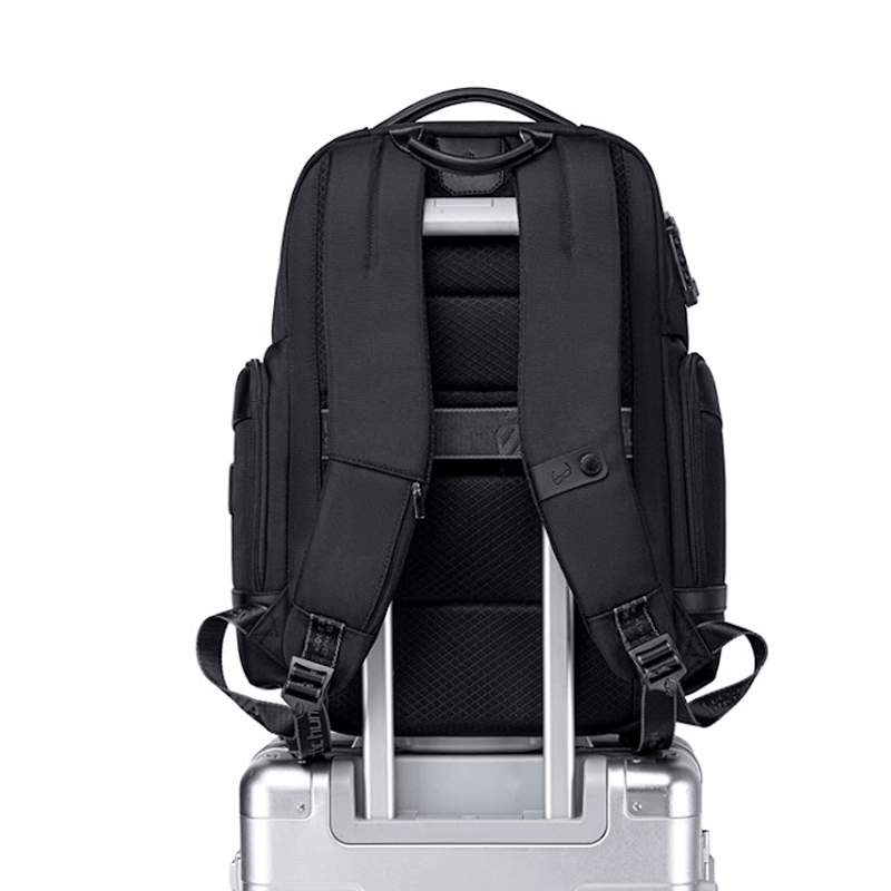 با نگاه به قسمت پشتی این کوله پشتی متوجه می شوید که یک جیب مخفی بر روی آن قرار گرفته است. این جیب مخفی مکانی عالی برای نگهداری از لوازم نفیس و گرانبهای کاربر خواهد بود. یک بند متصل شونده به دسته چمدان نیز بر روی این کوله پشتی قرار دارد.