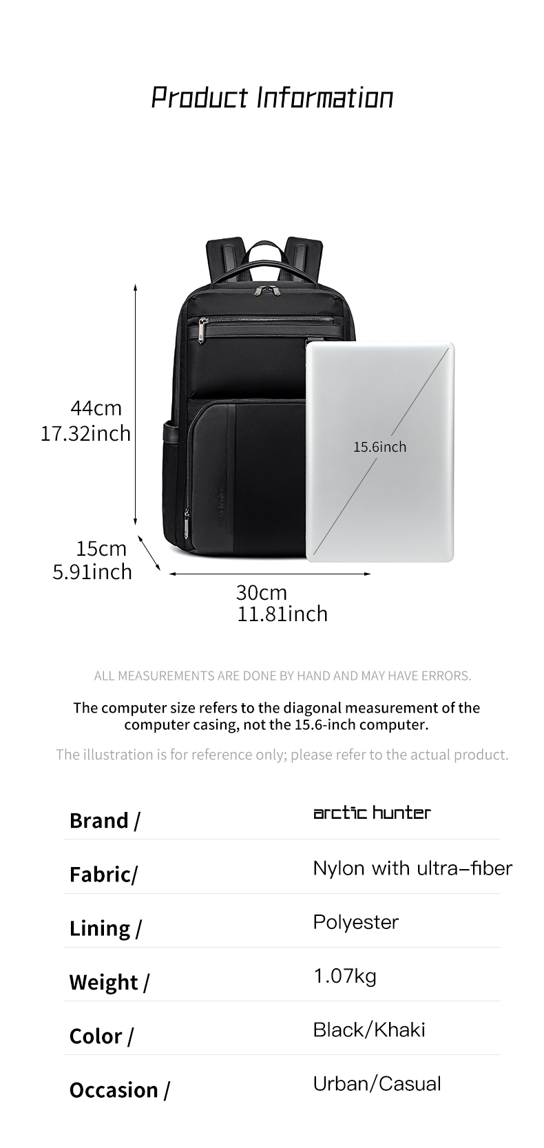 ابعاد و ظرفیت: کوله پشتی دارای ابعاد 44 × 30 × 15 سانتیمتر و ظرفیت 20 لیتر است که برای حمل لپتاپ، تبلت، لوازم جانبی و برخی وسایل شخصی مناسب میباشد.