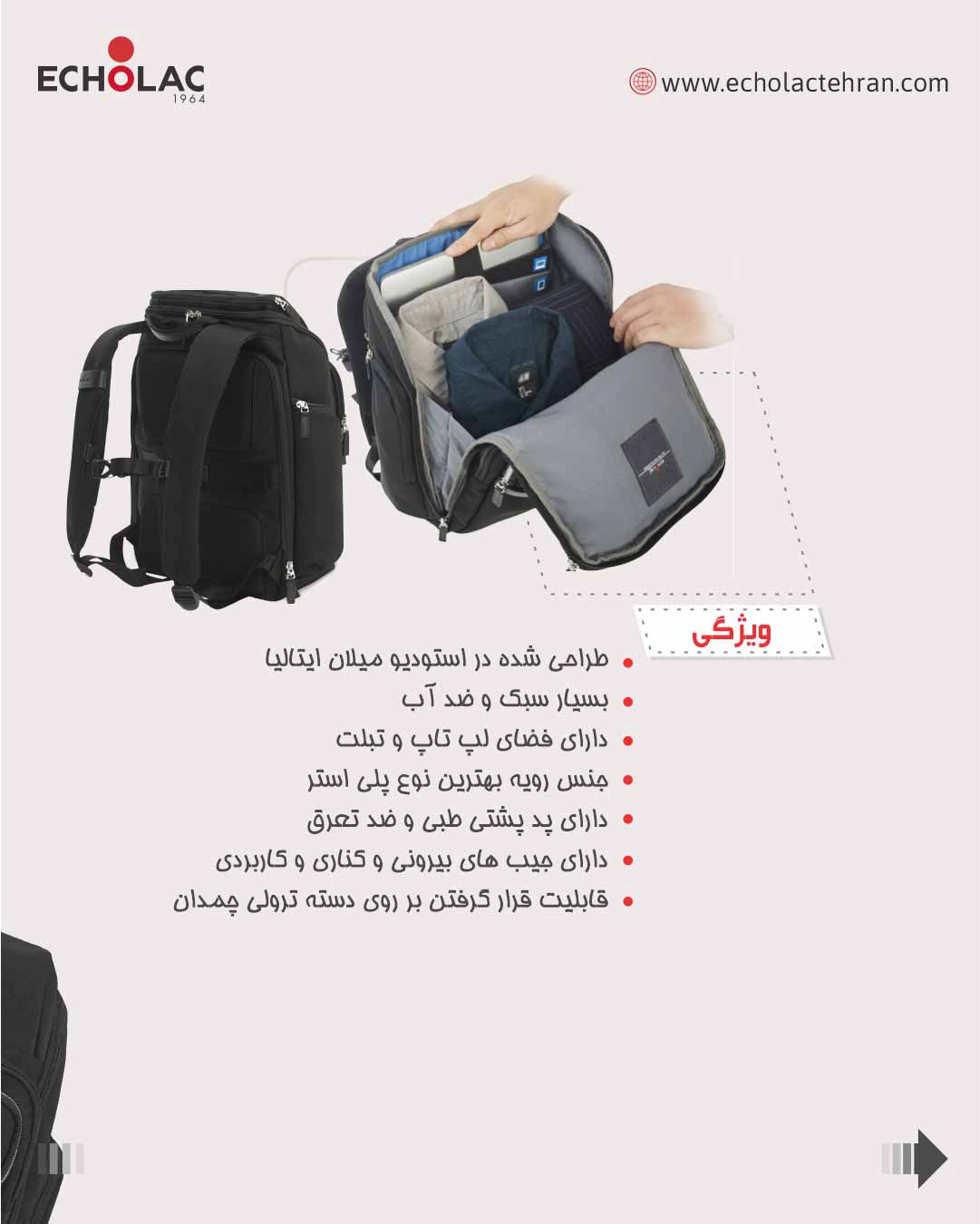 - دارای فضای اختصاصی برای تبلت و لپ تاپ تا 15 اینچ